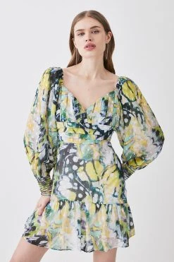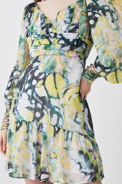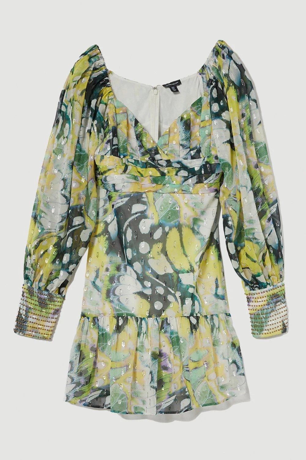 Crafted with iridescent metallic detailing and a butterfly print, this mini dress exudes romantic energy. Tiered details and a ruffle hem add an undeniably elegant mood. A sweetheart neckline, balloon sleeves and pearl-detailed cuffs add further character.